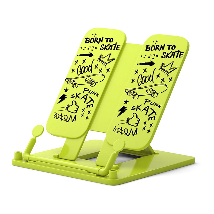Складная подставка с фиксатором для книг. Рисунок нанесен тампопечатью. Позволяет расположить книгу под удобным углом наклона (7 углов). Держатель, расположенный в нижней части, надежно фиксирует страницы. Ширина подставки — 235 мм, высота спинки — 190 мм.
