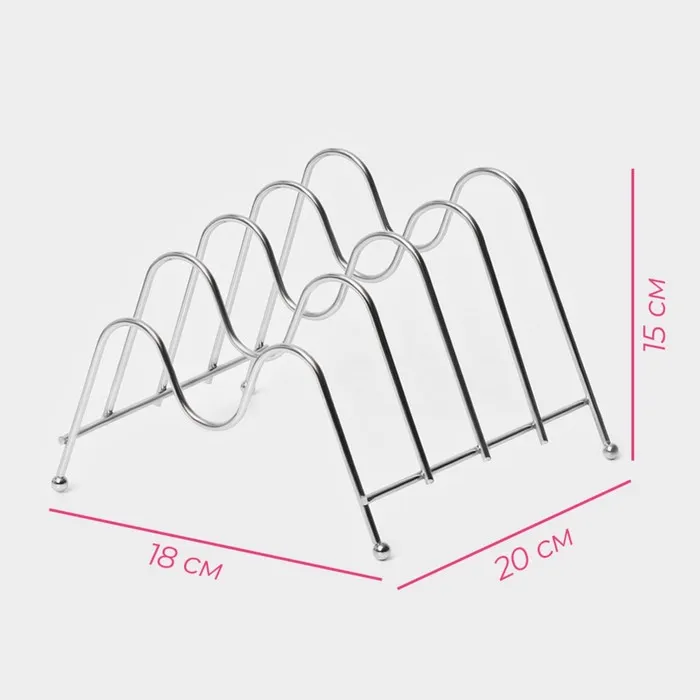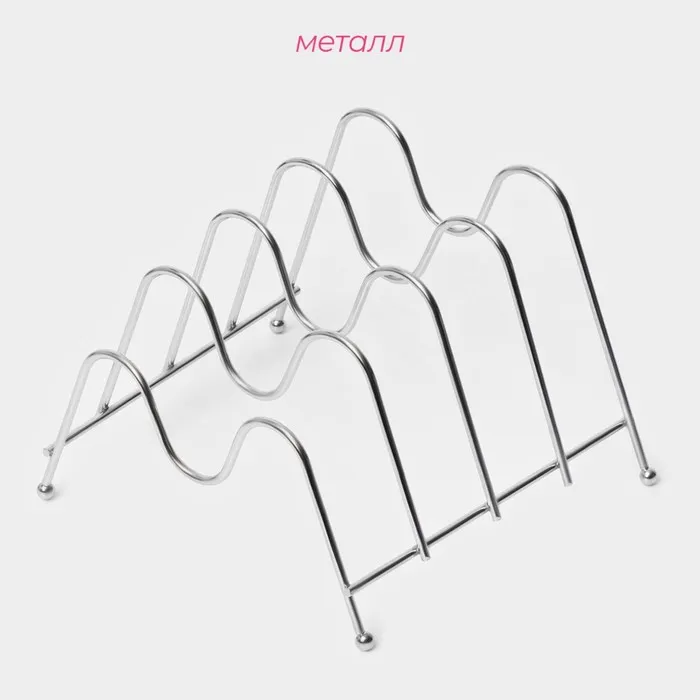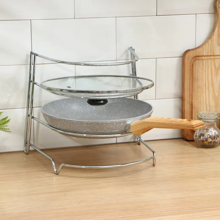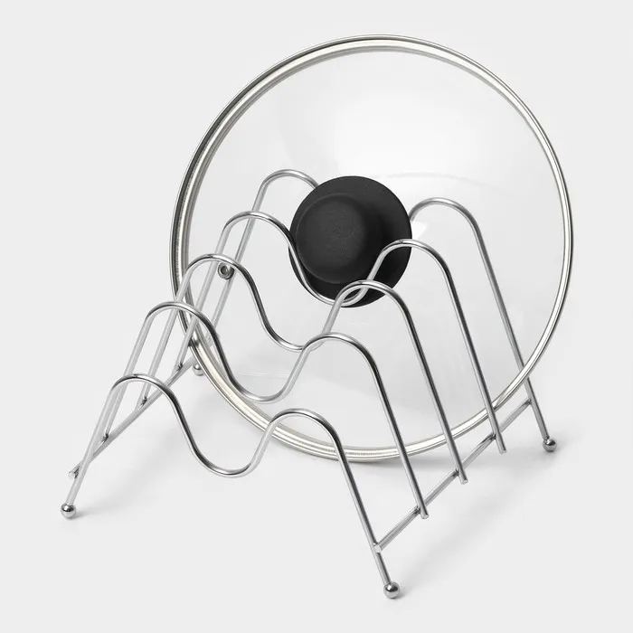 Благодаря продуманному дизайну, подставка позволяет компактно разместить до четырёх крышек различных размеров. Она изготовлена из высококачественного металла, что гарантирует прочность и долговечность. Хромированный цвет подставки придаёт ей стильный и современный вид, который прекрасно впишется в любой кухонный интерьер.