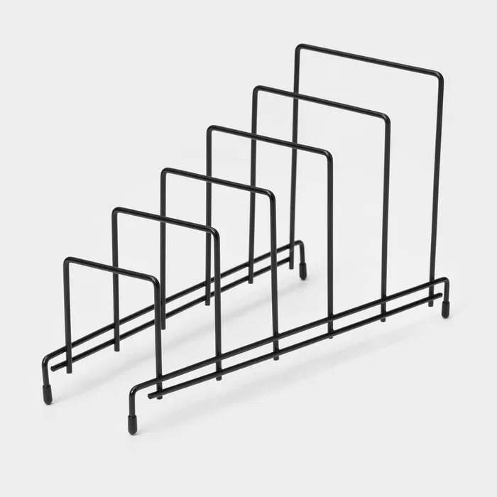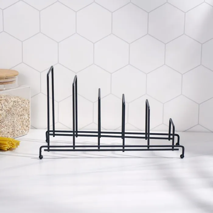 Благодаря продуманному дизайну, подставка позволяет компактно разместить до пяти крышек различных размеров. Она изготовлена из высококачественного металла, что гарантирует прочность и долговечность. Чёрный цвет подставки придаёт ей стильный и современный вид, который прекрасно впишется в любой кухонный интерьер.