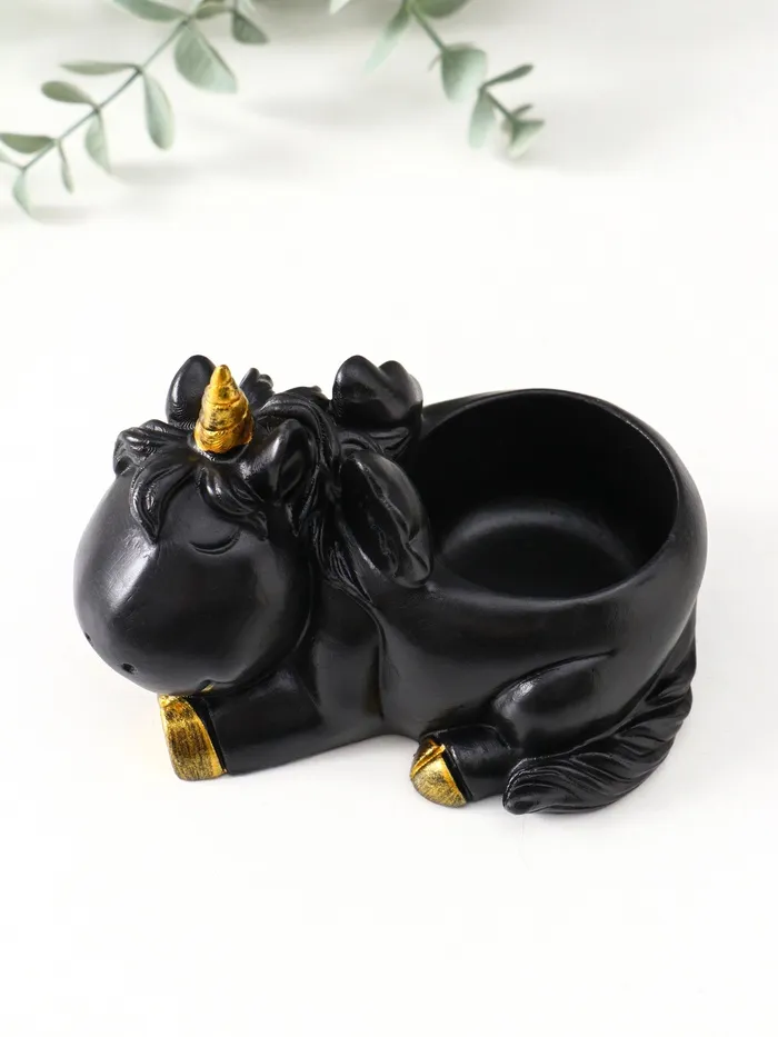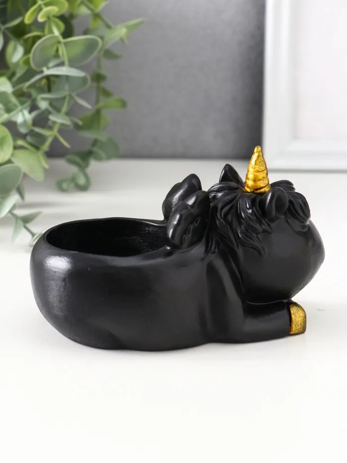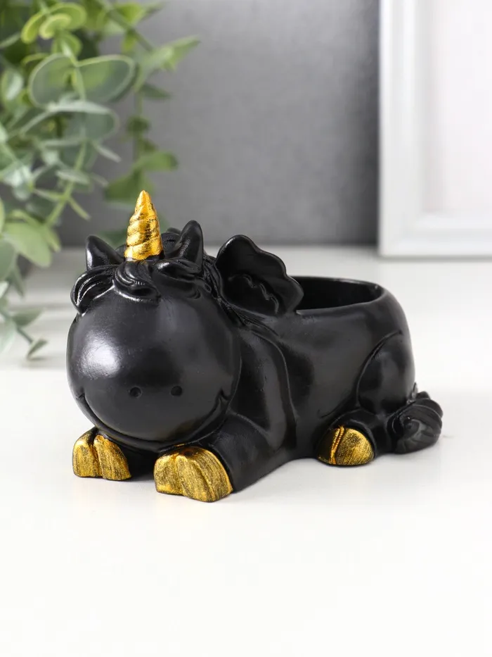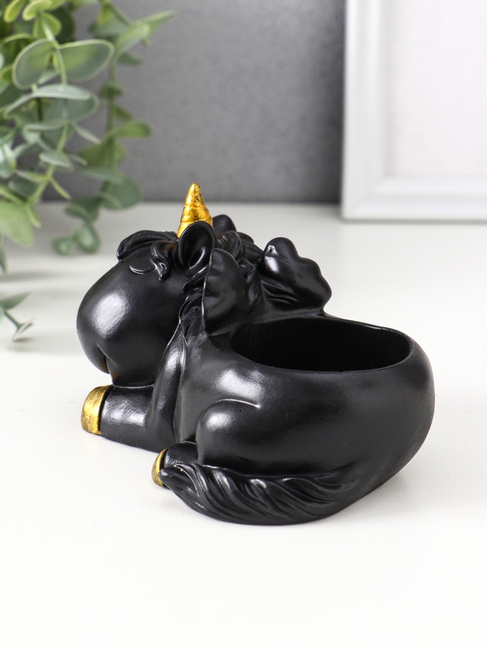 Эта подставка в форме единорога — стильное и практичное решение для хранения мелочей в любом помещении. Выполненная из гипса и покрытая чёрной краской, она привносит в интерьер нотку загадочности и элегантности, при этом оставаясь функциональным аксессуаром.