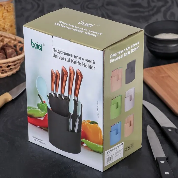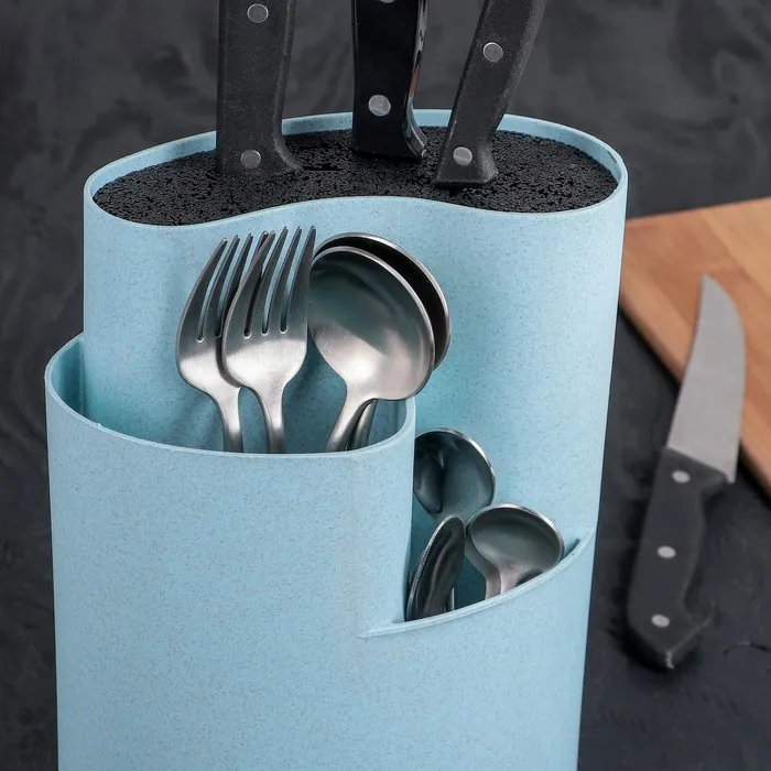 Благодаря подставке все ножи и столовые приборы всегда будут рядом. Кухонный органайзер не требует особого ухода. Он сэкономит место на вашей кухне и сохранит остроту лезвия ножей. Стильный дизайн станет отличным дополнением к любому интерьеру.