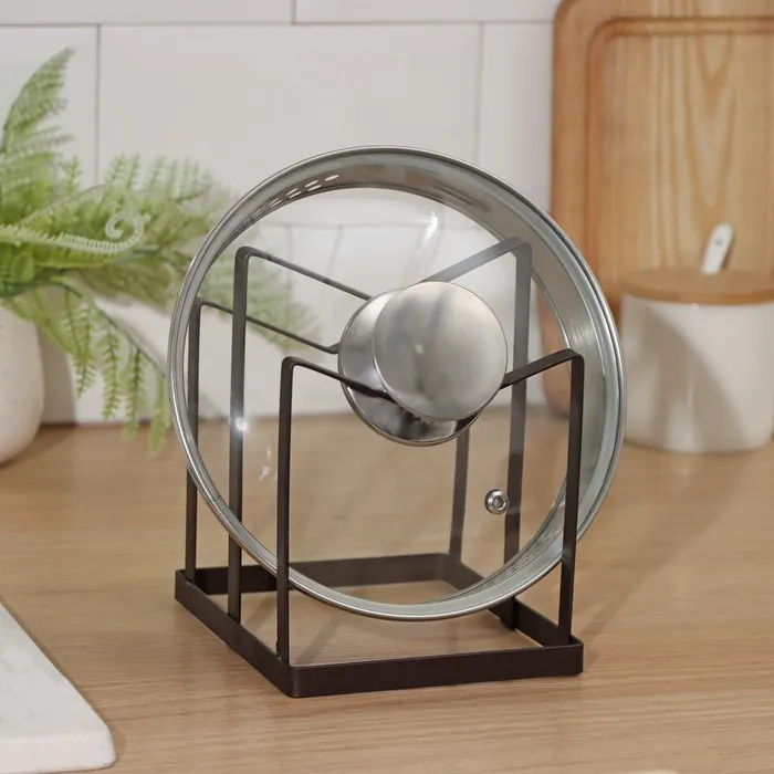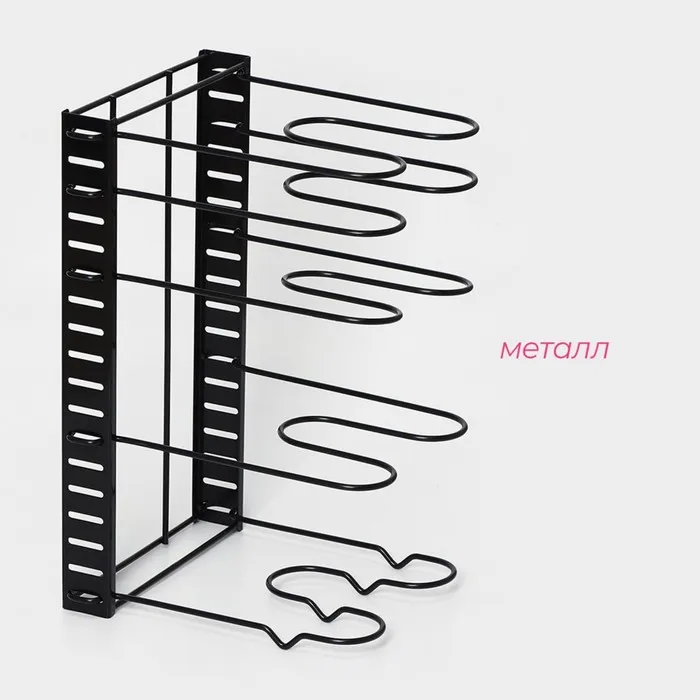 Удобная подставка предназначена для экономии места на кухне, а именно компактного хранения сковородок и крышек в одном месте.