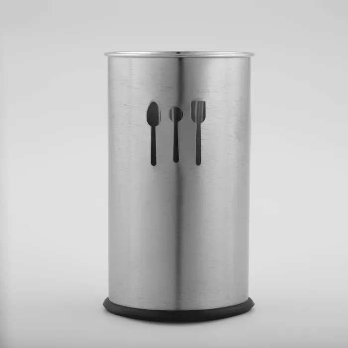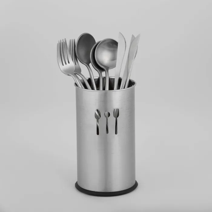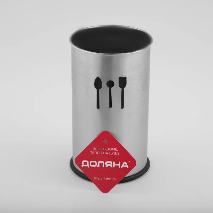 Подставка для столовых приборов «Доляна» имеет небольшие отверстия для отвода лишней влаги. Круглое устойчивое основание выполнено из резины. Его легко снять, чтобы вылить накопившуюся воду. Подходит для размещения ложек, вилок, ножей и предметов кухонной утвари.
