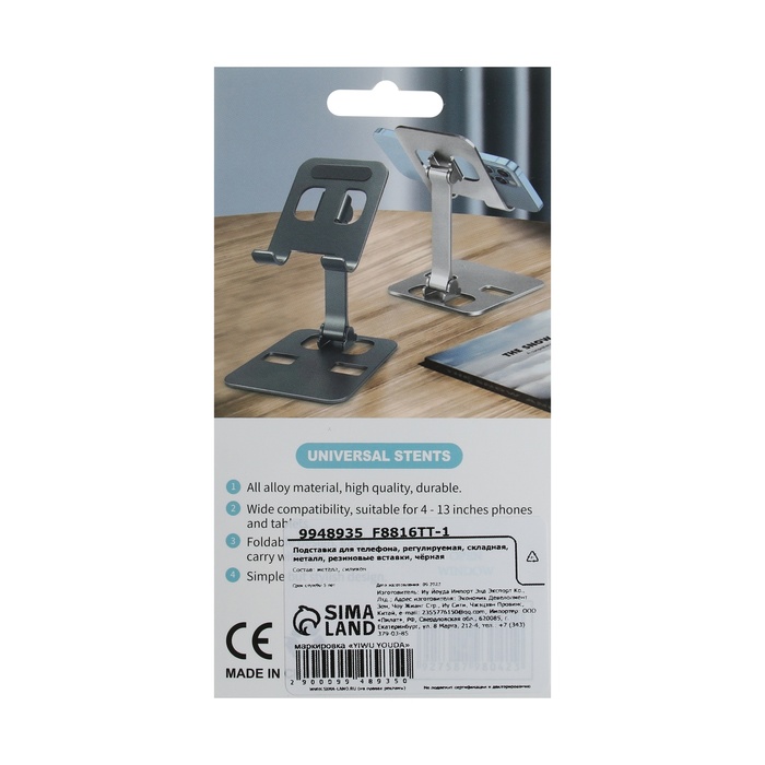 Подставка для телефона, регулируемая, складная, металл, резиновые вставки, чёрная — Характеристики