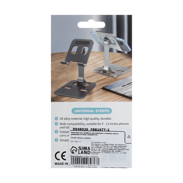 Подставка для телефона, регулируемая, складная, металл, резиновые вставки, серебристая — Характеристики