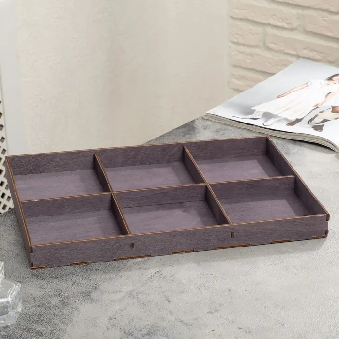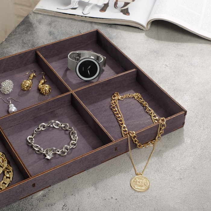 Подставка для украшений с 6 ячейками, размером 35×24×3 см, выполнена из прочного материала толщиной 3 мм и окрашена в стильный цвет полисандр. Это идеальный аксессуар для аккуратного хранения ваших украшений, таких как кольца, серьги, браслеты и другие аксессуары. Благодаря 6 просторным ячейкам, ваши драгоценности будут всегда в порядке и легко доступны.