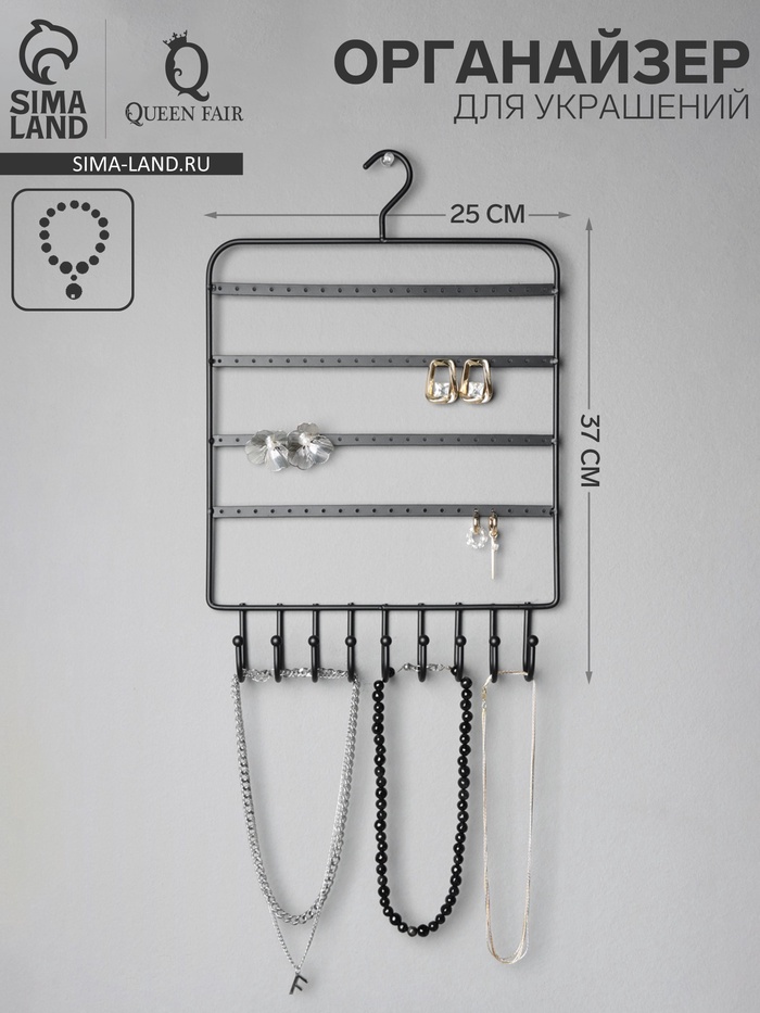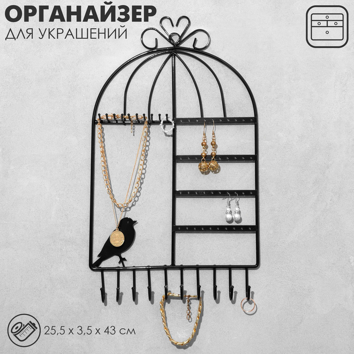 Подставка для украшений «Клетка с птичкой» 20 пар серёг и 20 крючков, 25.5×3.5×43 см, цвет чёрный — Характеристики