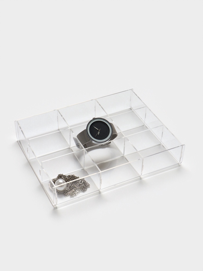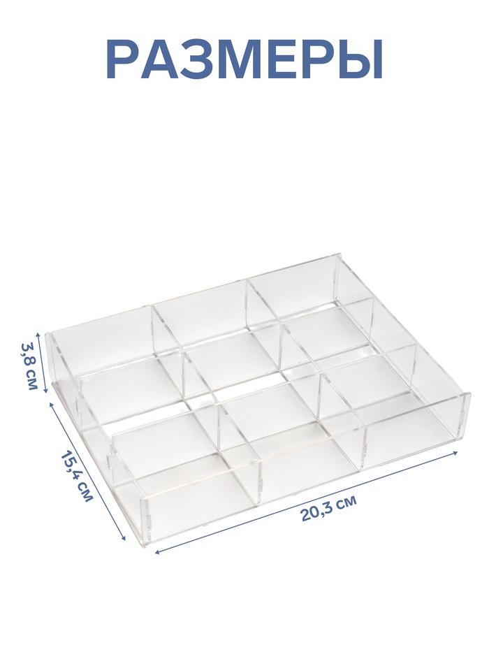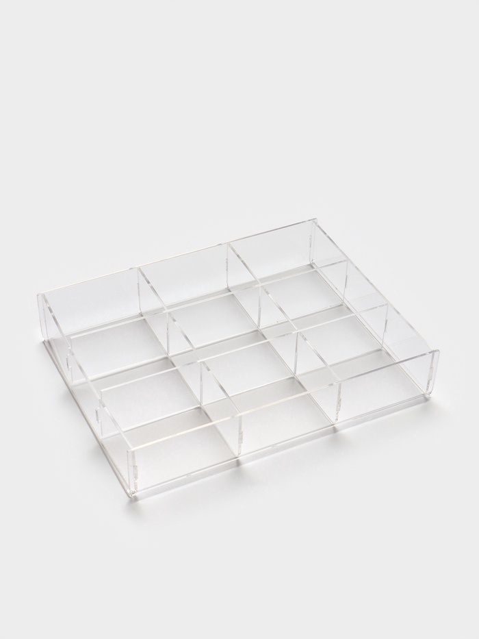 Организуйте пространство стильно и функционально с универсальным органайзером из прозрачного оргстекла. Его лаконичный дизайн и компактные габариты идеально подойдут для хранения украшений, косметических принадлежностей, мелких аксессуаров или даже лекарственных препаратов. Девять удобных отсеков обеспечивают порядок и доступность каждого предмета, сохраняя вашу коллекцию аккуратной и организованной.