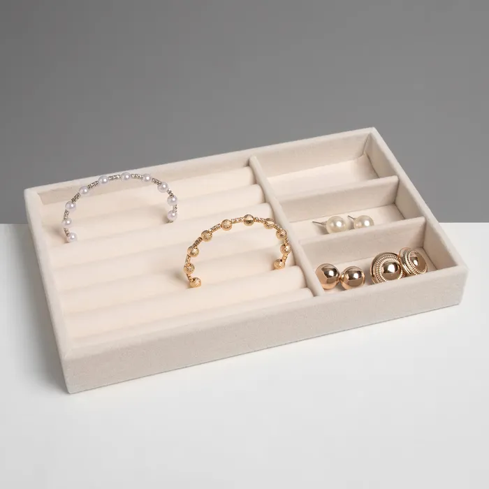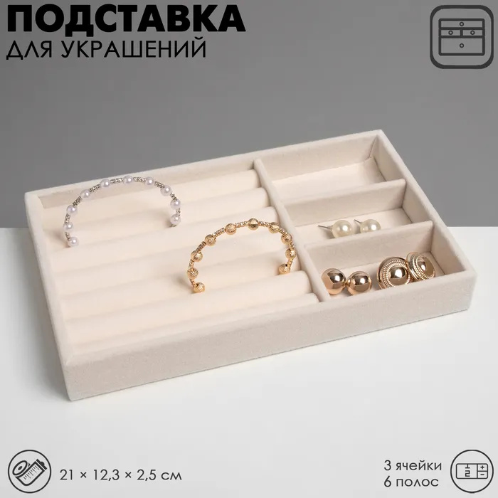 Подставка для украшений QF 3 ячейки и 7 полос для колец, флок, 21×12,3×2,5 см, цвет бежевый — Характеристики