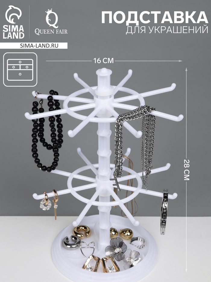 Подставка для украшений QF «Вертушка», 3 яруса, 48 пар, металл, 11×11×28 см, цвет белый — Характеристики