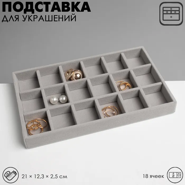 Подставка для украшений QF18 ячеек, флок, 21×12,3×2,5 см, цвет серый — Характеристики