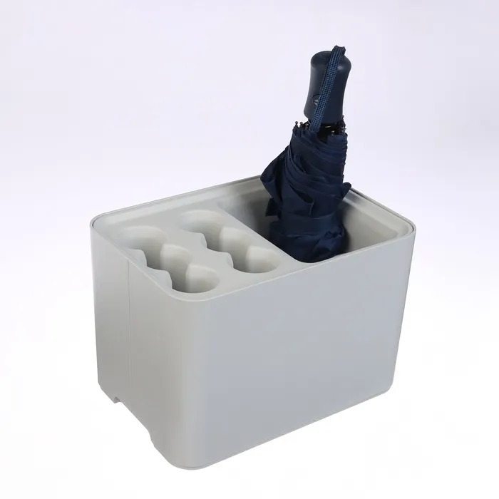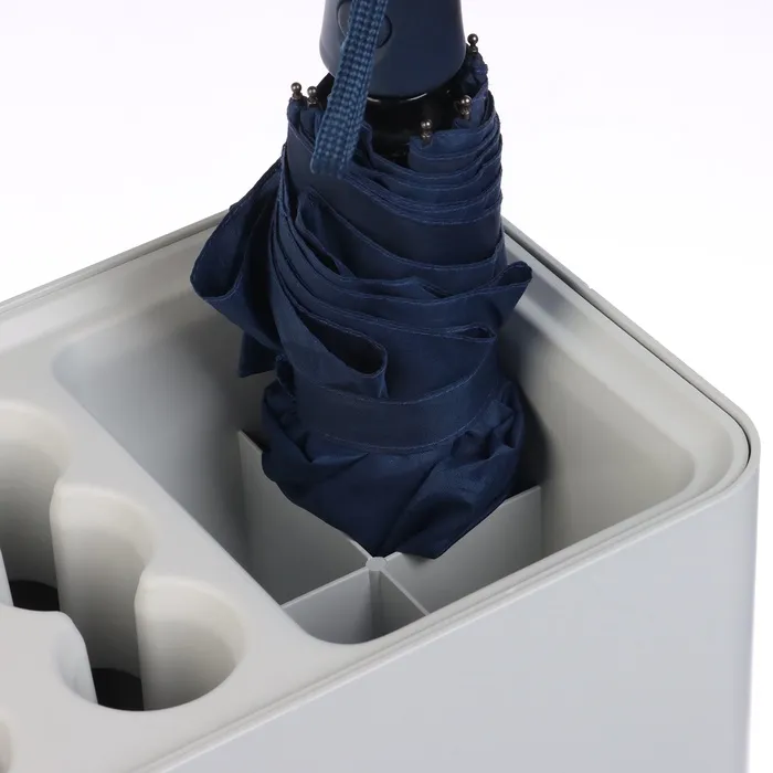 Изготовленная из прочного пластика, эта подставка обеспечивает надежное и безопасное хранение ваших зонтов, предотвращая их случайное падение и повреждение. Удобная конструкция позволяет легко организовать пространство, а компактные размеры делают ее идеальной для использования как в прихожей, так и в офисе.