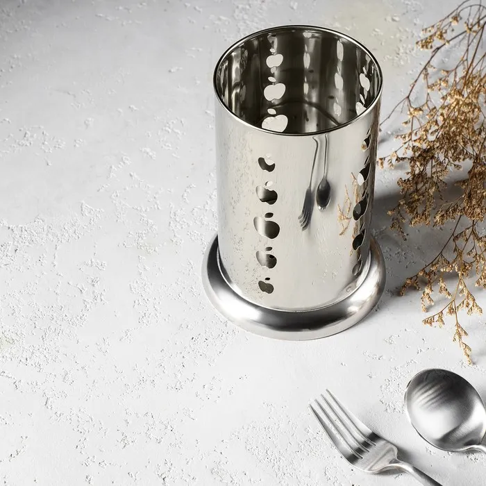 Подставка для столовых приборов имеет небольшие отверстия для отвода лишней влаги. Подходит для ложек, вилок, ножей и других предметов кухонной утвари.
