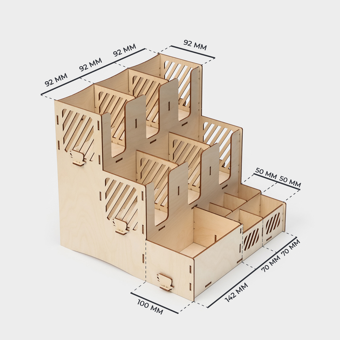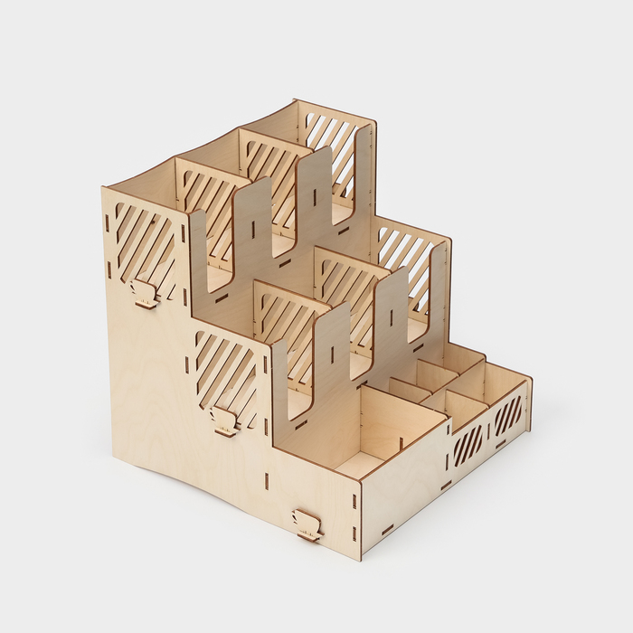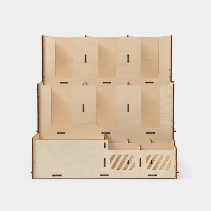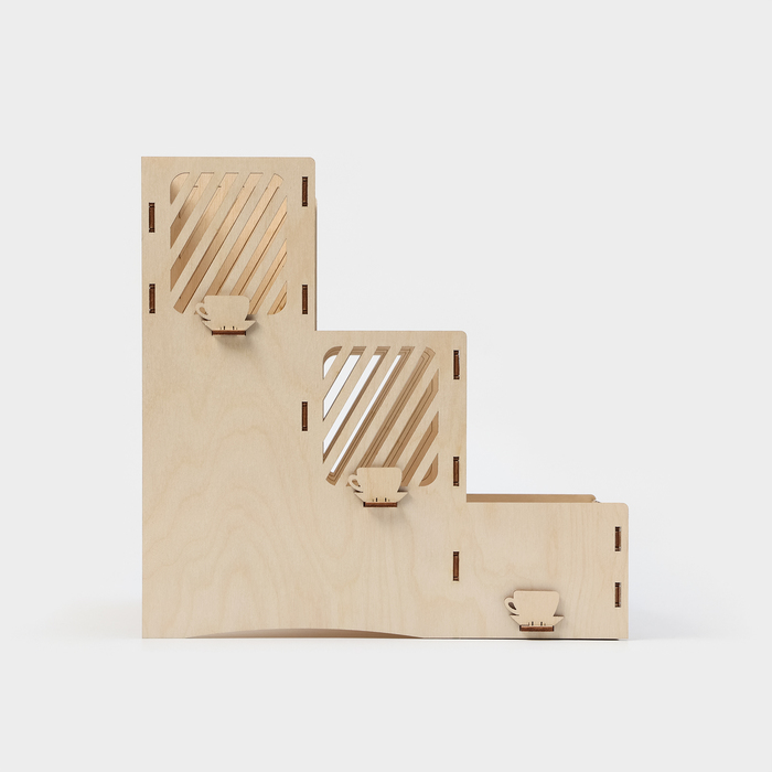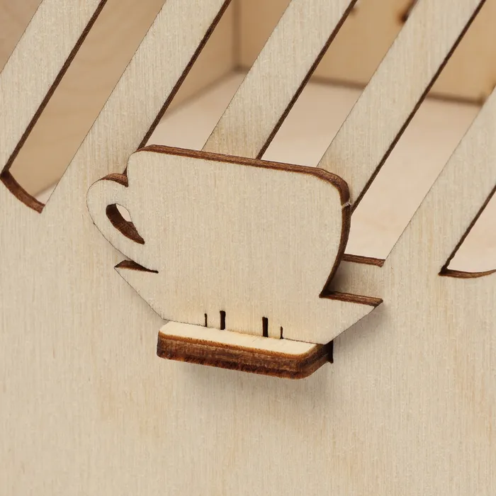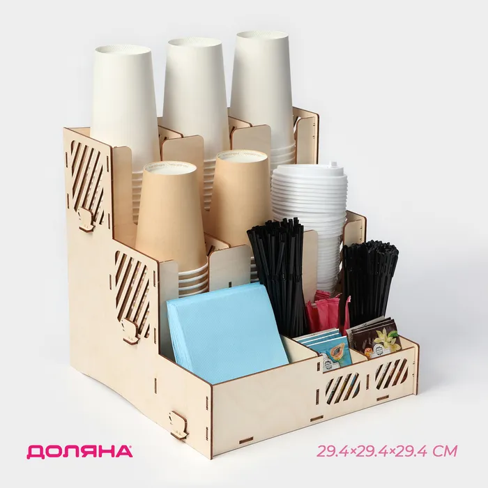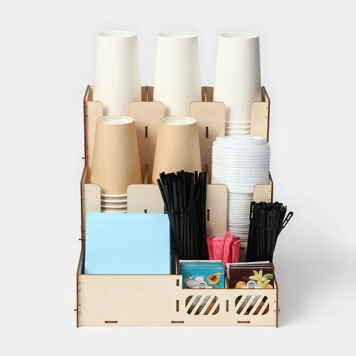 Органайзер состоит из нескольких отделений, каждое из которых предназначено для определенного предмета. Например, одно отделение может быть предназначено для хранения стаканов, другое - для крышек, а также для салфеток, трубочек, чайных пакетиков и сахара.