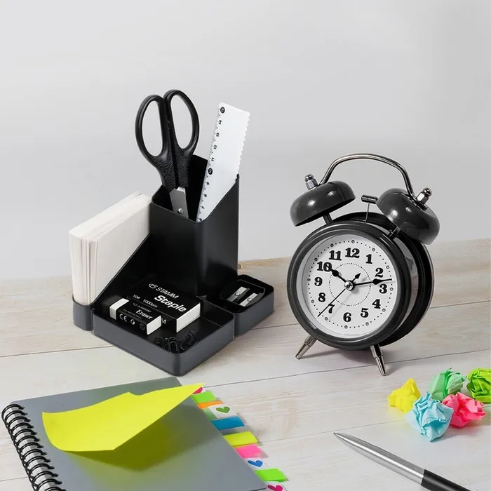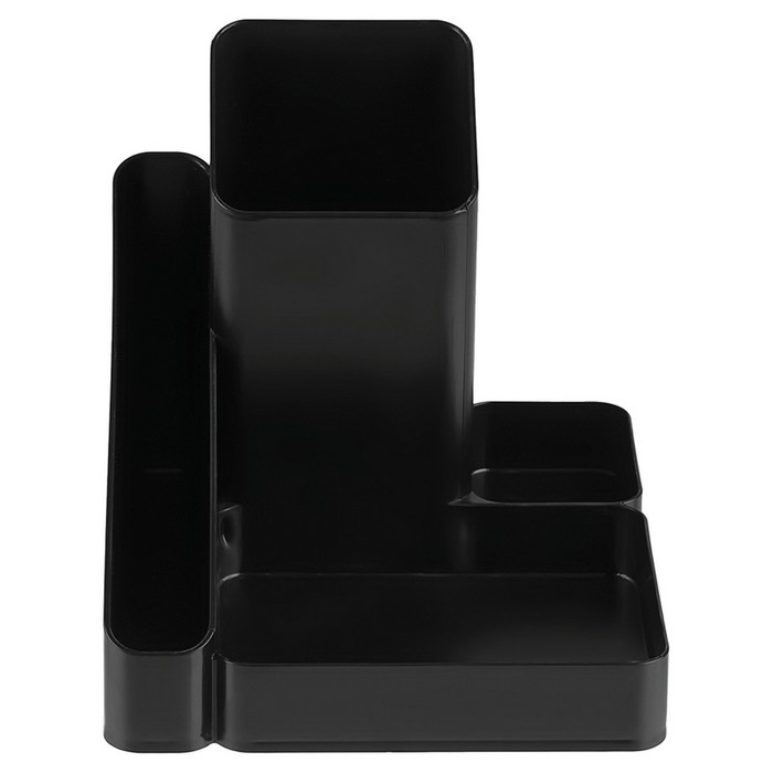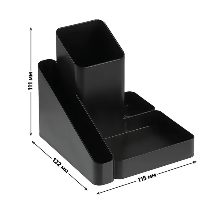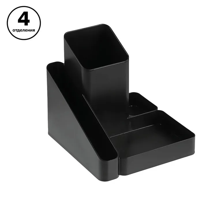 Компактный стильный органайзер для рабочего стола с 4 отделениями для канцелярских принадлежностей. Прочный корпус, гладкая глянцевая поверхность. Высота подставки - 111 мм.