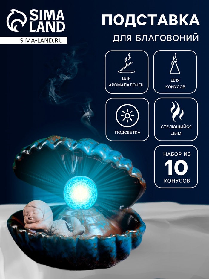 Подставка для благовоний TAKE IT EASY «Девочка в ракушке», набор благовоний конусы, стелющийся дым, 11×10 см, с подсветкой, батарейки LR44