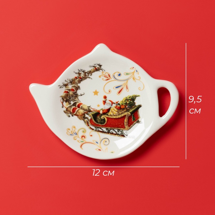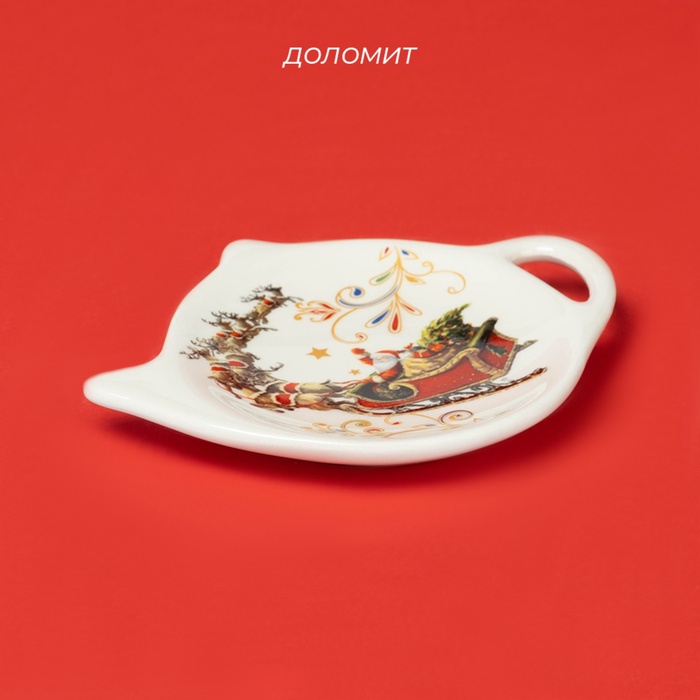 Эта праздничная подставка для чайных пакетиков сочетает функциональность с новогодней эстетикой. Компактный размер 12×9 см удобен для размещения на чайном столике или рядом с чашкой, а доломитовая основа обеспечивает устойчивость. Бело-красная гамма с изображением саней Деда Мороза создаёт настроение праздника даже в мелких деталях сервировки.
