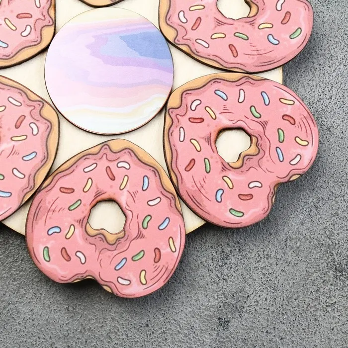 Подставка под горячее в форме «Пончика» — это не просто защита для столешницы, а полноценный элемент сервировки и декора. Её размер — 20×20 см, форма — фигурная, что делает её заметной и практичной. Изделие выполнено из натурального можжевельника, известного своими приятными тактильными свойствами и лёгким ароматом древесины. Поверхность украшена ярким рисунком, который добавляет изделию настроения и делает его уместным как подарком к 8 Марта, так и повседневным аксессуаром на кухне.