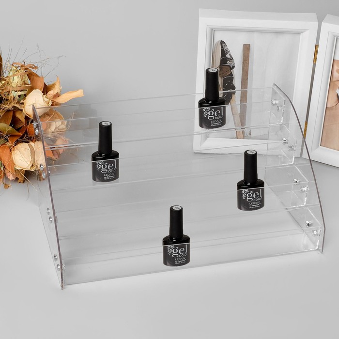 С ее прозрачным дизайном ваши лаки всегда будут в центре внимания, при этом порядок в вашем обиходе будет поддерживаться легко и просто. Каждый уровень подставки аккуратно вмещает бутылочки, делая выбор нужного оттенка быстрым и удобным.