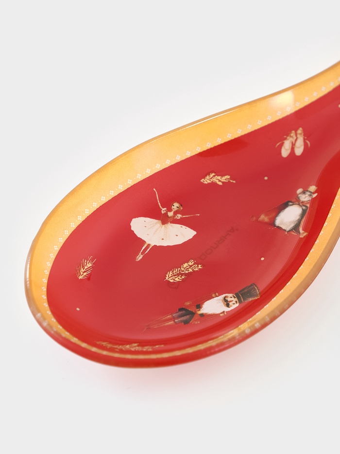 Пусть даже мелочи на праздничном столе говорят о Новом годе! Новогодняя подставка под ложку — изящная деталь сервировки из красного стекла с тематическим узором. Она решает простую задачу: держать ложку в чистоте, не пачкая скатерть, — и делает это с праздничным настроением.