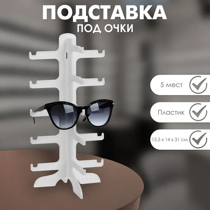Компактная подставка под очки на 5 мест идеально подходит для аккуратного хранения и демонстрации. Габариты 15,5×14×31 см делают её удобной для использования на прилавках магазинов или в домашних условиях. Белый цвет и минималистичный дизайн подчёркивают стиль аксессуаров. Подставка надёжно удерживает очки, предотвращая их повреждение. Практичное и стильное решение для демонстрации очков.