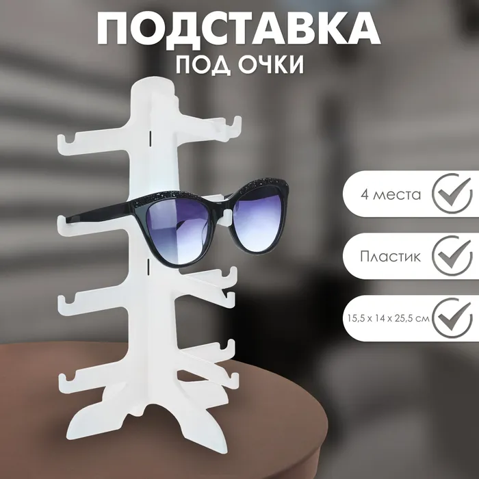 Компактная подставка под очки на 4 места идеально подходит для аккуратного хранения и демонстрации. Габариты 15,5×14×25,5 делают её удобной для использования на прилавках магазинов или в домашних условиях. Белый цвет и минималистичный дизайн подчёркивают стиль аксессуаров. Подставка надёжно удерживает очки, предотвращая их повреждение. Практичное и стильное решение для демонстрации очков.