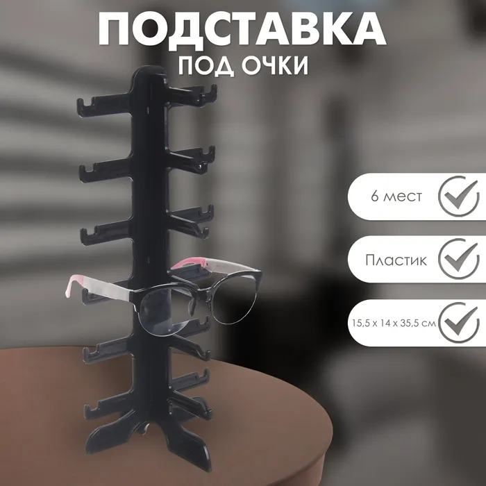 Компактная подставка под очки на 6 мест идеально подходит для аккуратного хранения и демонстрации. Габариты 16×14,5×35,5 см делают её удобной для использования на прилавках магазинов или в домашних условиях. Чёрный цвет и минималистичный дизайн подчёркивают стиль аксессуаров. Подставка надёжно удерживает очки, предотвращая их повреждение. Практичное и стильное решение для демонстрации очков.