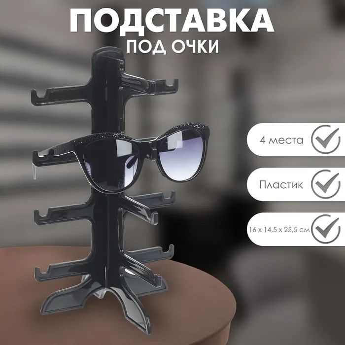 Компактная подставка под очки на 4 места идеально подходит для аккуратного хранения и демонстрации. Габариты 15,5×14×25,5 делают её удобной для использования на прилавках магазинов или в домашних условиях. Чёрный цвет и минималистичный дизайн подчёркивают стиль аксессуаров. Подставка надёжно удерживает очки, предотвращая их повреждение. Практичное и стильное решение для демонстрации очков.