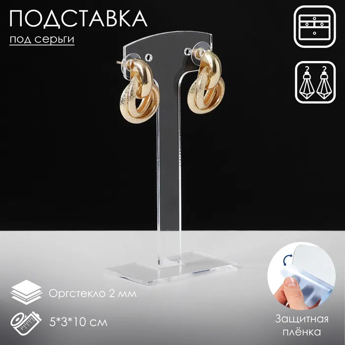 Компактная подставка для двух пар серёг, размером 5×3×10 см, идеально подходит для использования в витринах и демонстрации украшений. Простой дизайн и прозрачное оргстекло обеспечивают удобство использования и эстетичный вид. Подставки из оргстекла (листовой акрил). Благодаря использованию 100% акрила, подставки имеют идеальную прозрачность, высочайший блеск и шикарный внешний вид. ВНИМАНИЕ: Изделия поставляются в матовой защитной плёнке, белого, синего, зелёного или прозрачного цвета, которую необходимо удалить перед оценкой качества или перед использованием.