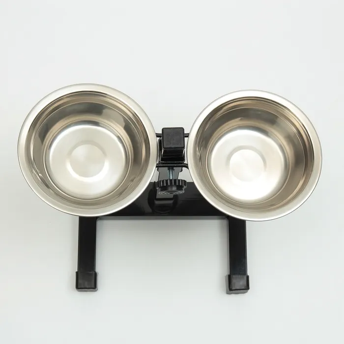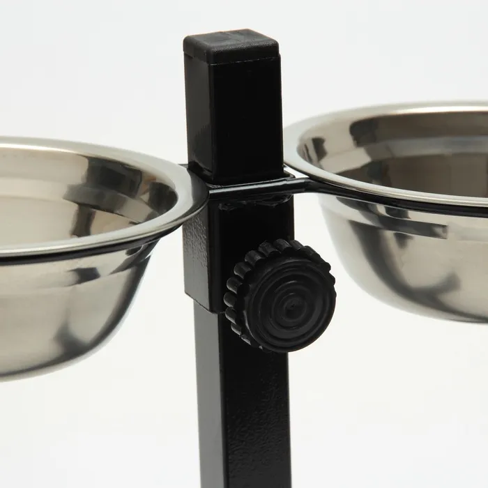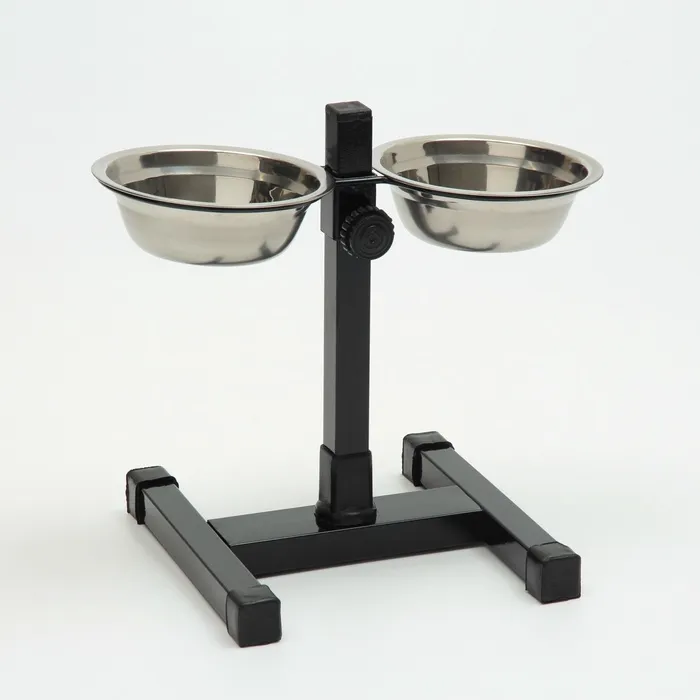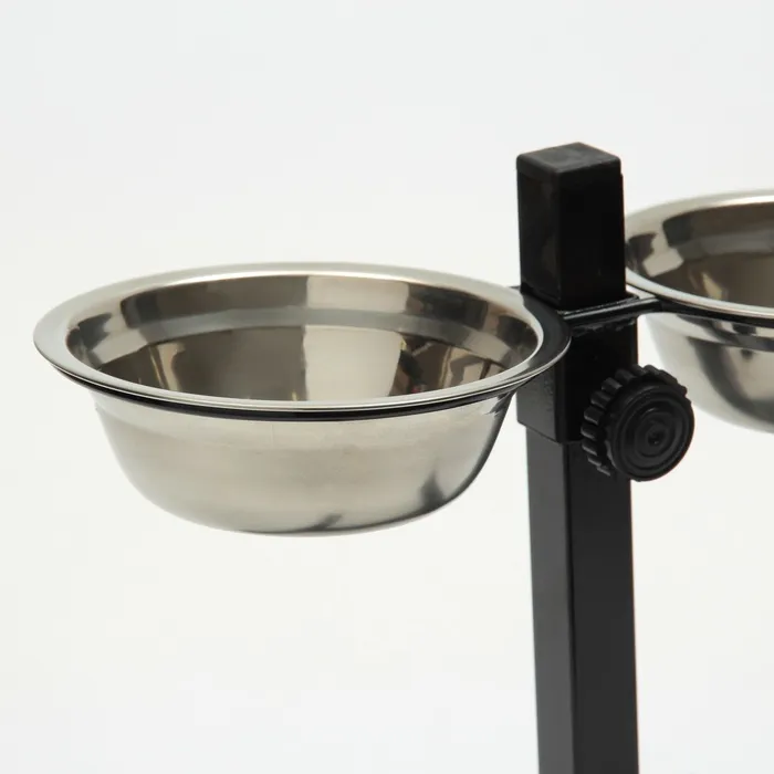 Стойка с 2-мя мисками для кормления сразу нескольких животных, это – идеальное решение для кормления щенков и собак подростков, живущих на одной территории. Качественные, практичные и функциональные миски для собак размещены на регулируемой подставке, которая будет «расти» вместе с вашими малышами. Винтовая кормушка убережёт помещение от загрязнения кормом и водой. Металлическая конструкция очень устойчивая, поэтому ее очень сложно сдвинуть или опрокинуть даже самым активным щенкам. Стойка и миски хорошо переносят обработку горячей водой, моющими и дезинфицирующими средствами.