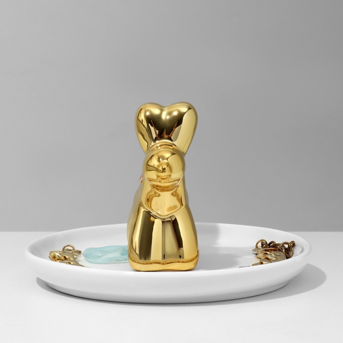Стильная подставка из керамики в форме собаки объединяет в себе функциональность и декоративность, позволяя аккуратно хранить украшения и создавать уют в вашем пространстве. Белый фон с золотистыми акцентами придаёт изделию изысканный вид, который гармонично впишется в любой интерьер.