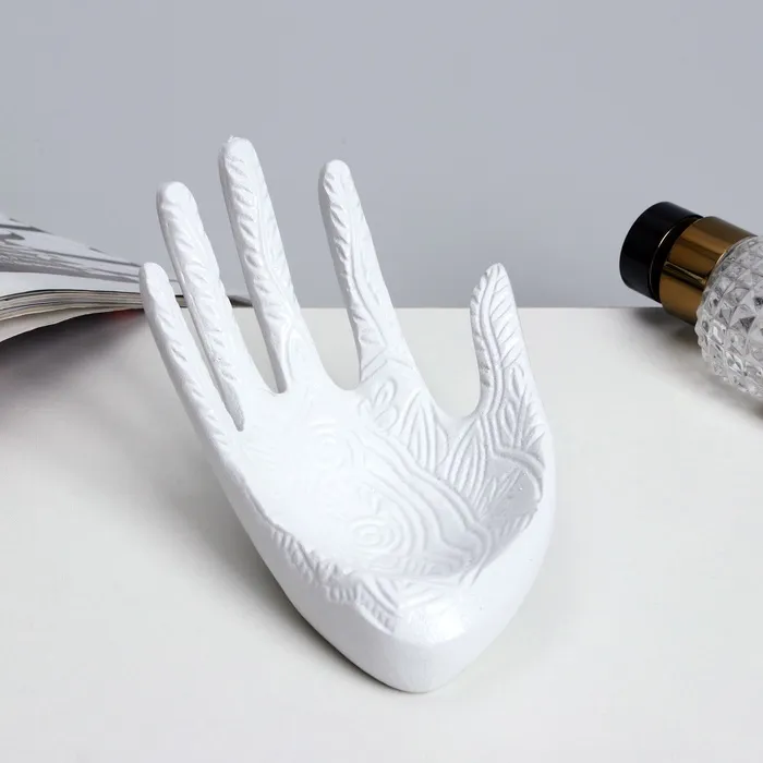 Изготовленная из полистоуна, подставка отличается прочностью и приятной на ощупь матовой поверхностью, которая надёжно удерживает кольца, браслеты и мелкие аксессуары, предотвращая их случайное падение. Её универсальный дизайн в виде руки придаёт интерьеру оригинальность и лёгкость, а нейтральный белый цвет гармонично вписывается в любые стилистические решения.