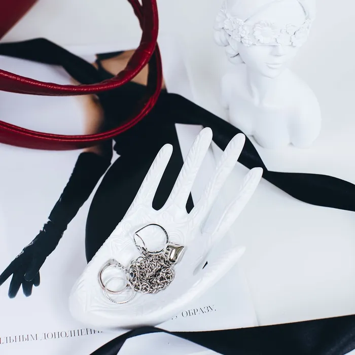 Белая подставка в форме ладони — это изящное сочетание функциональности и эстетики, созданное для удобного хранения украшений. Размеры 14×9×9 см делают её компактным и практичным аксессуаром, который легко разместится на туалетном столике или полке, не занимая много места.