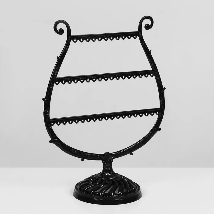 Черная универсальная подставка в форме арфы — продуманное решение для хранения и демонстрации украшений. Вместимость на 23 места позволяет удобно разместить серьги и другие мелкие аксессуары, обеспечивая порядок и быстрый доступ к любимым изделиям.