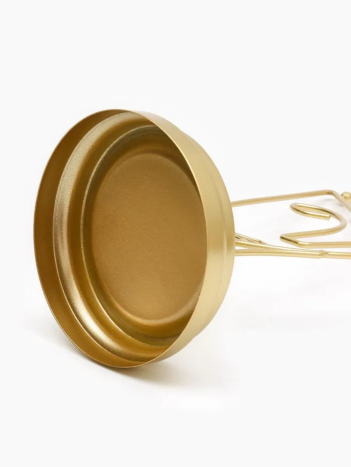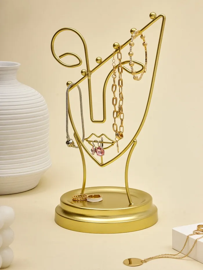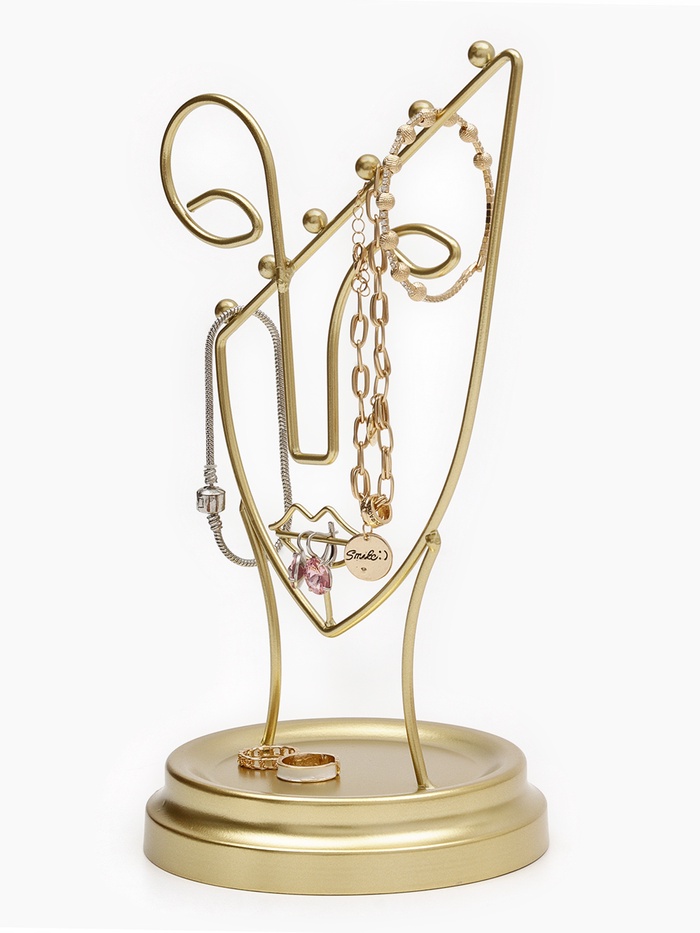 Изготовленная из прочного металла с изысканным золотистым покрытием, подставка гарантирует долговечность и устойчивость, позволяя бережно хранить серьги, кольца, браслеты и цепочки. Универсальность конструкции делает её незаменимой в повседневной организации пространства, а декоративный внешний вид превращает аксессуар в акцентный элемент интерьера.