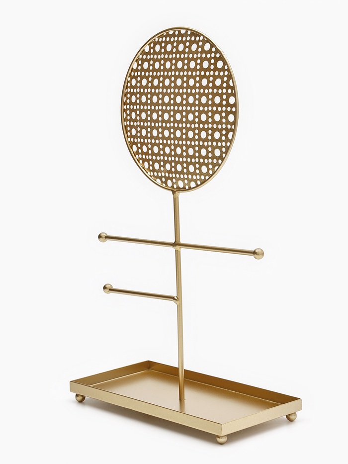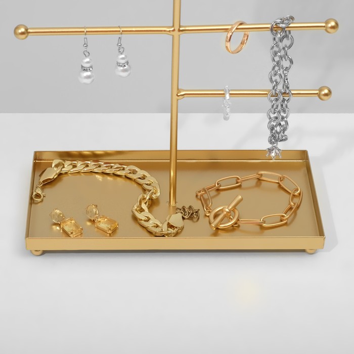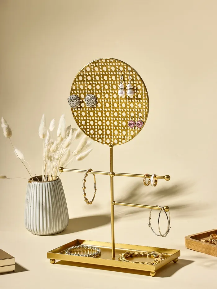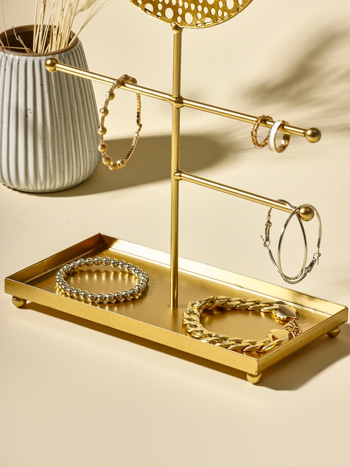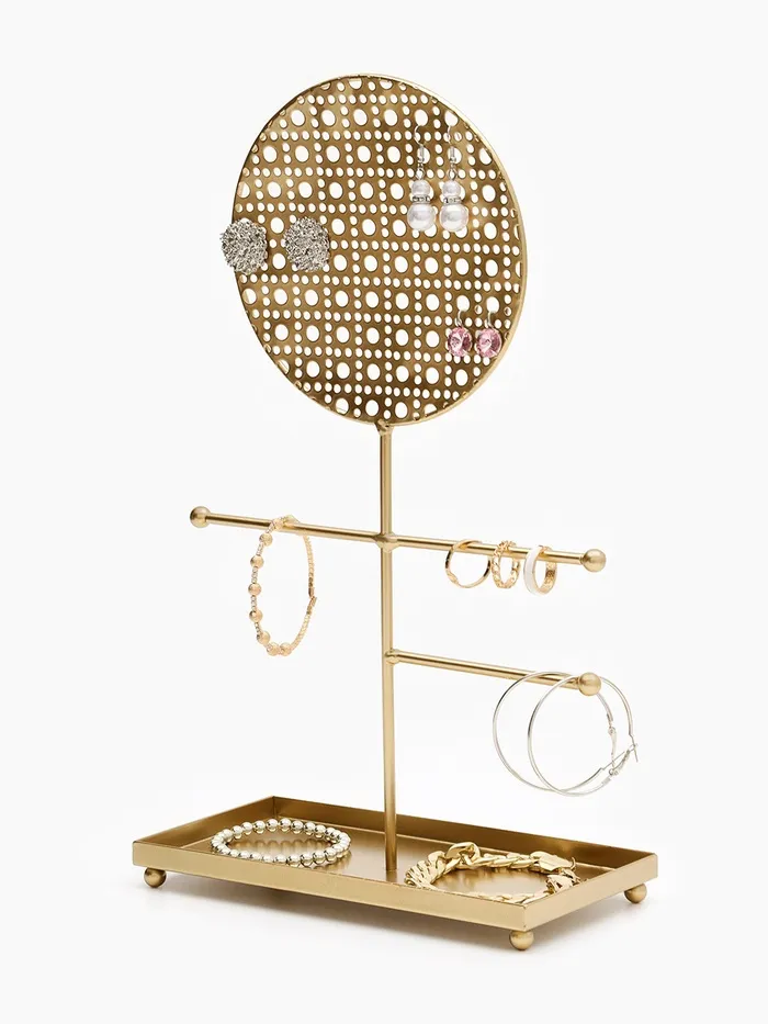 Металлическая конструкция с изящной ажурной отделкой придаёт изделию лёгкость и утончённость, а универсальный дизайн подходит для хранения серёжек, колец, браслетов и цепочек. Благодаря продуманной форме, украшения легко размещаются и не запутываются, что значительно упрощает их выбор и использование в повседневной жизни.
