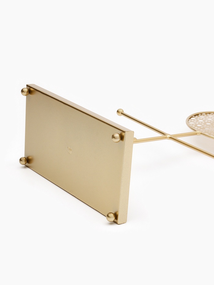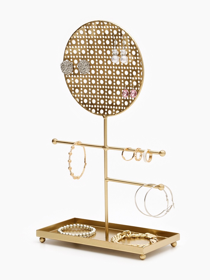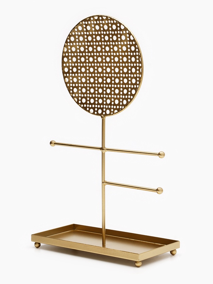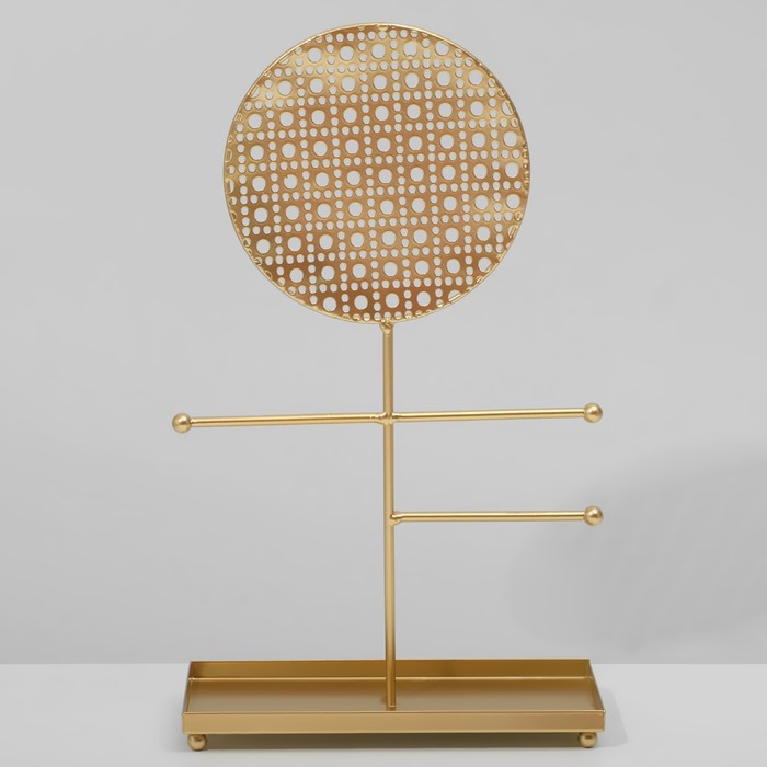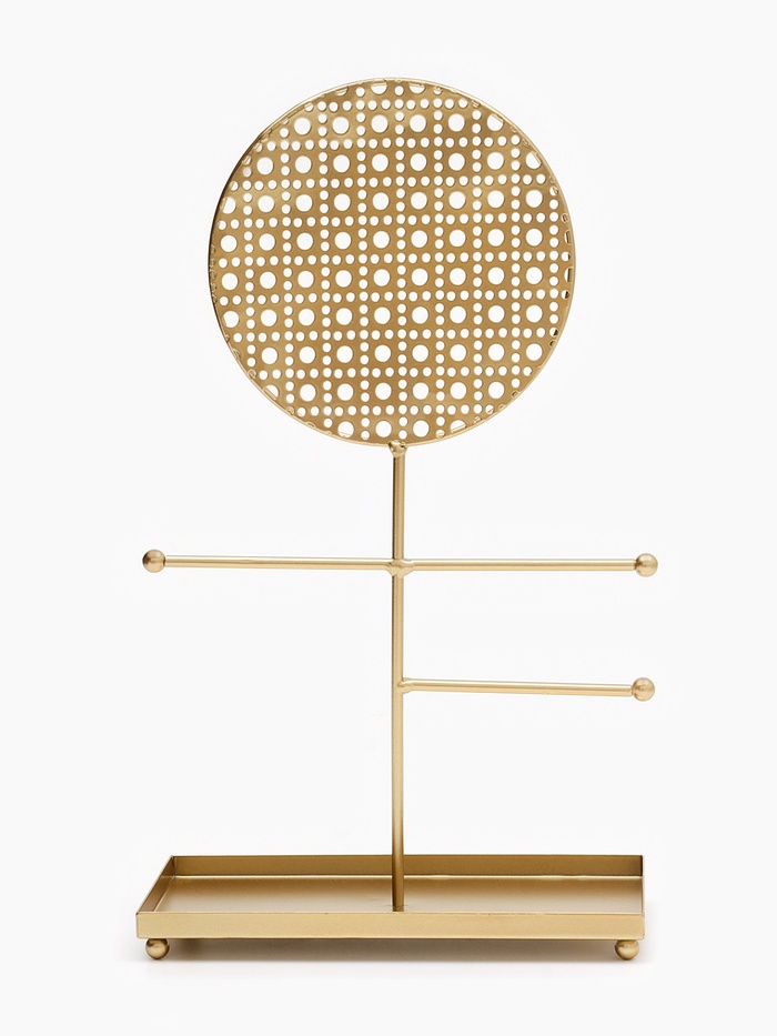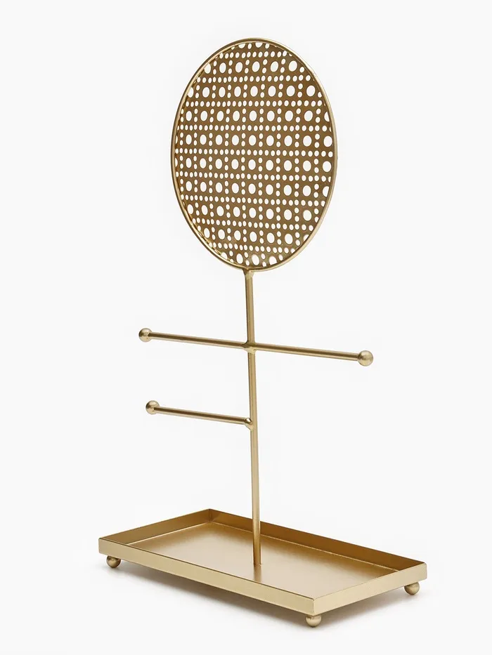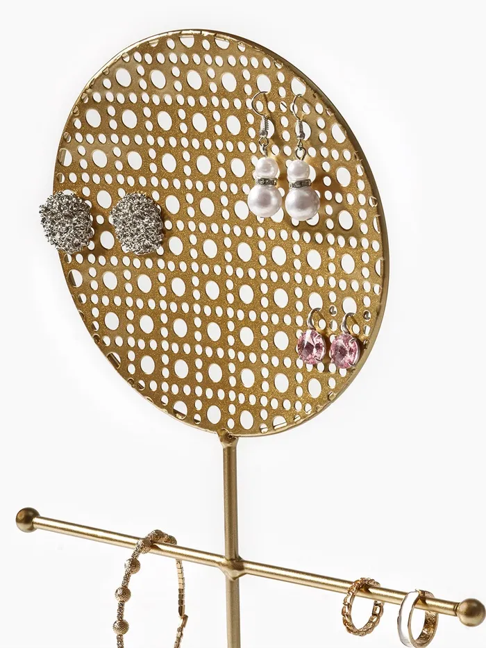 Изящная подставка с ажурным круглым основанием в золотистом цвете сочетает в себе функциональность и декоративность, создавая идеальное пространство для хранения украшений. Высота 34,5 см и компактные габариты 20×10 см позволяют разместить аксессуары на видном и удобном месте, при этом не занимая много места.