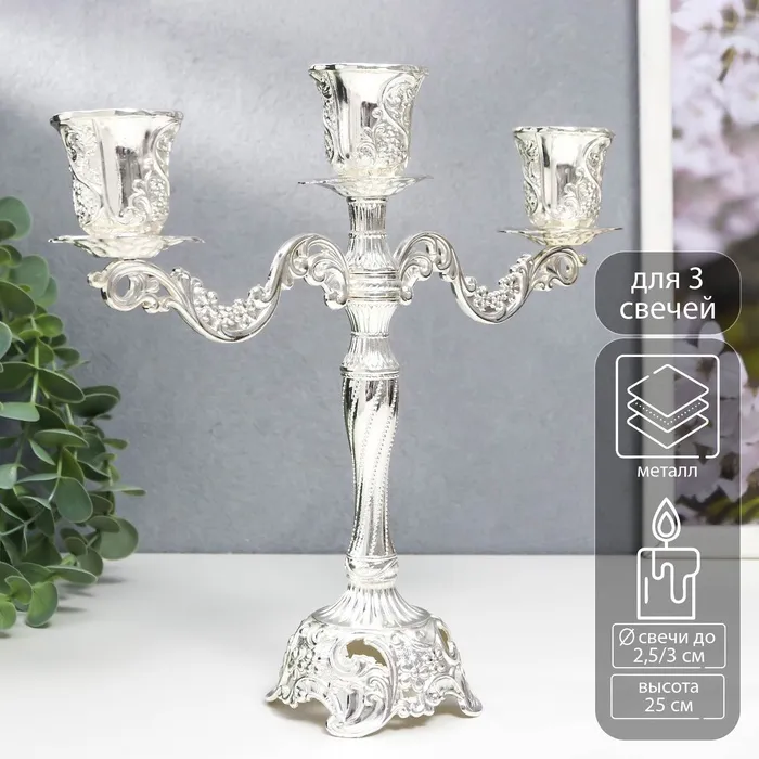 Металлический подсвечник на 3 свечи «Канделябр. Виноградная лоза», серебро, 22×7.5×25 см