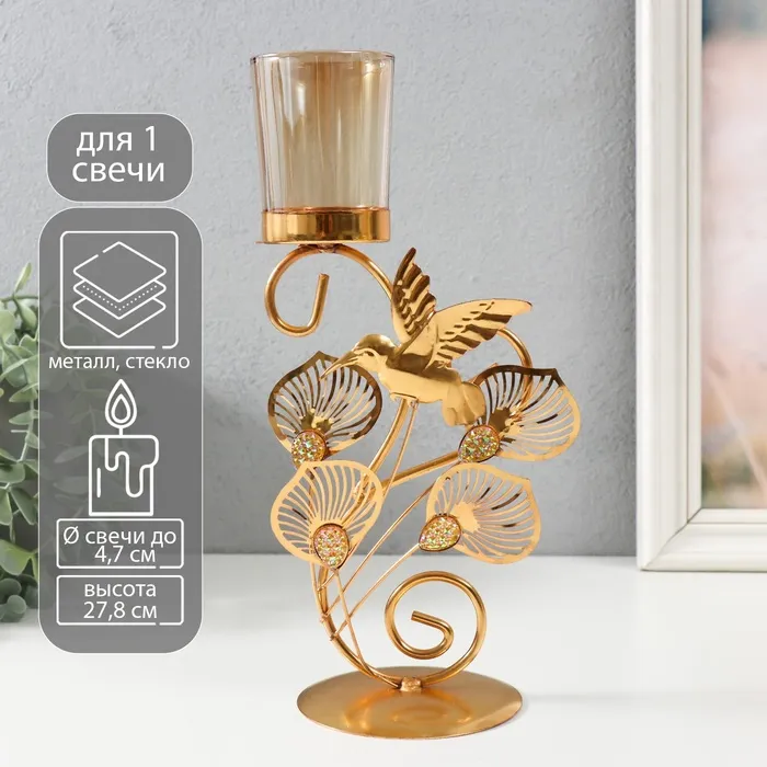 Подсвечник металл, стекло на 1 свечу «Полет колибри», d=4.7 см, золото, 15.5×9×27.8 см