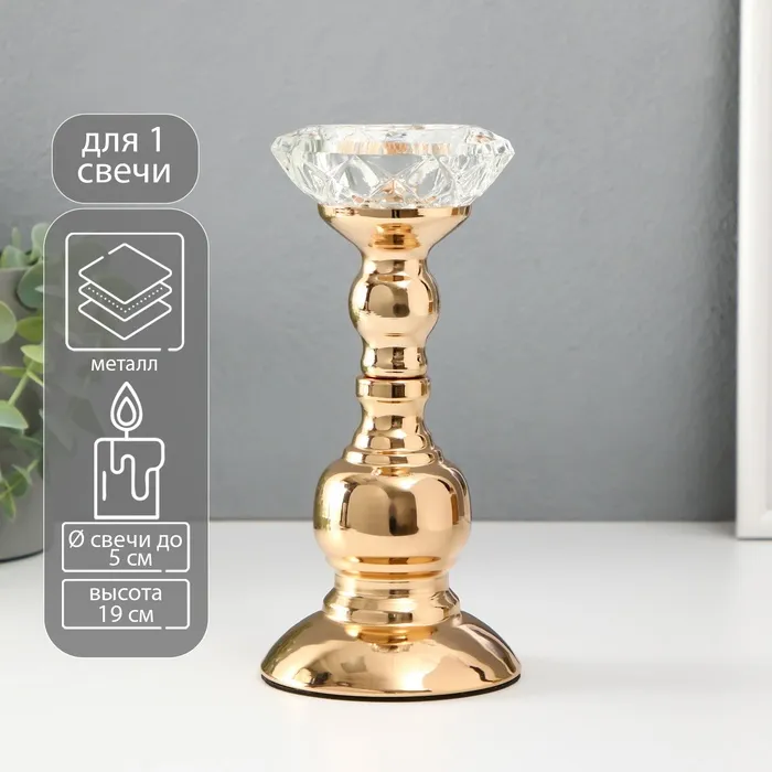 Подсвечник металл, стекло на 1 свечу «Кристальная чаша. Фигурный», d=5 см, золото, 8×8×19 см