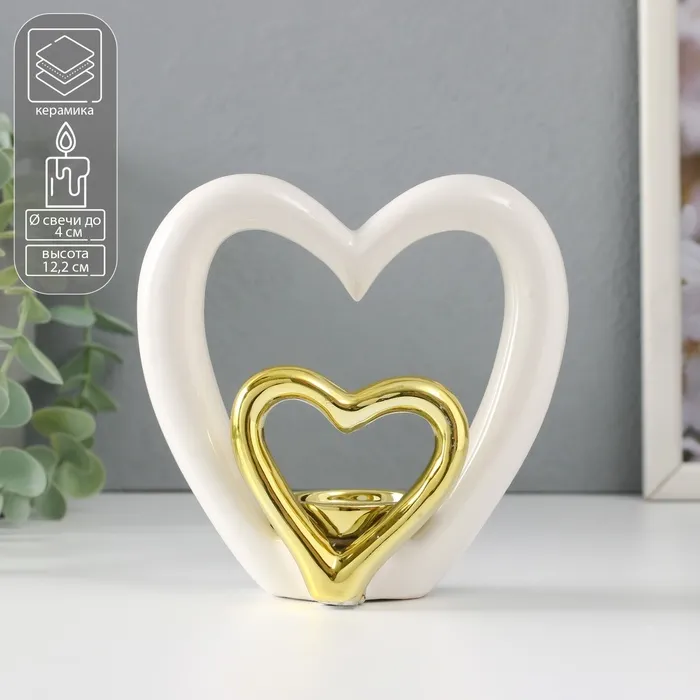 Подсвечник керамика на 1 свечу «Сердце в сердце», белое с золотом, 12.7×5.5×12.2 см