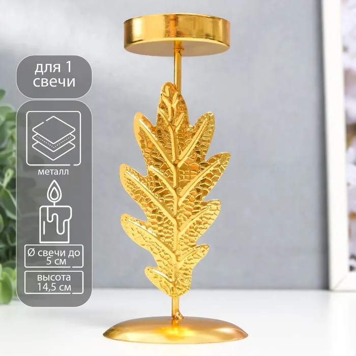 Металлический подсвечник на 1 свечу «Дубовый лист», d=5 см, золото, 6.5×6.5×14.5 см