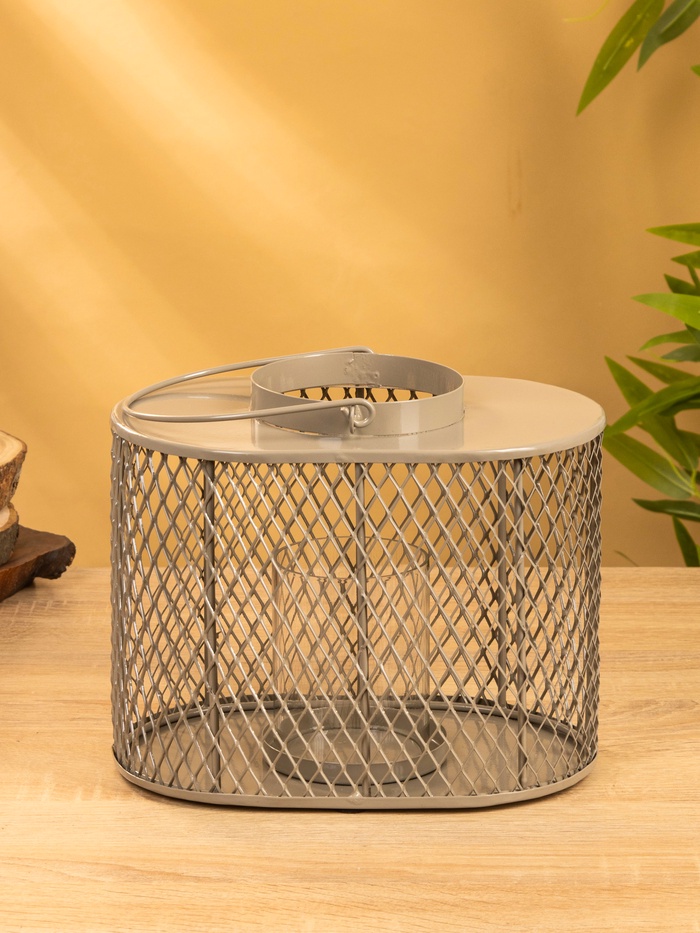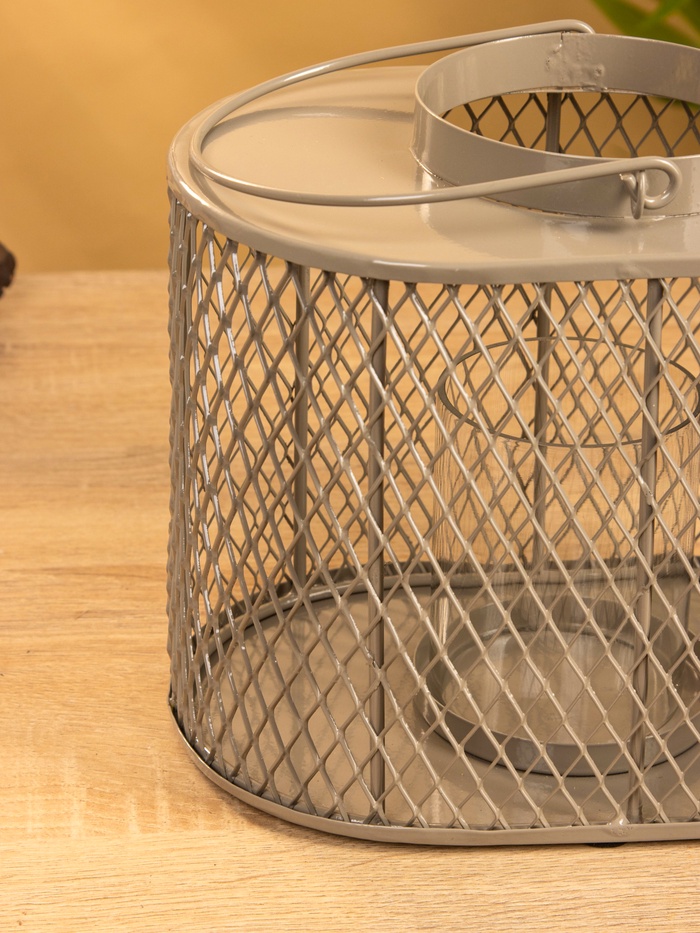 Серый фонарь-подсвечник со стеклянной колбой — не аксессуар, а элемент пространства, который работает на баланс и свет. Его размеры 19,5×23×15,5 см — компактно, но вместительно. Матовый серый металл не бросается в глаза, а поддерживает пламя. Стекло защищает огонь, не искажая его.