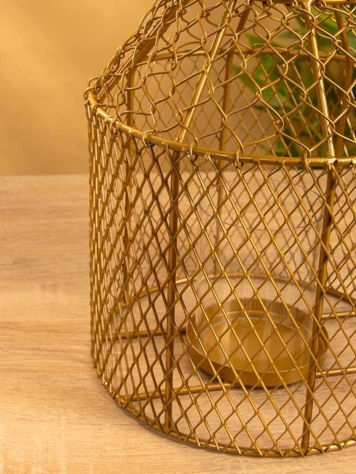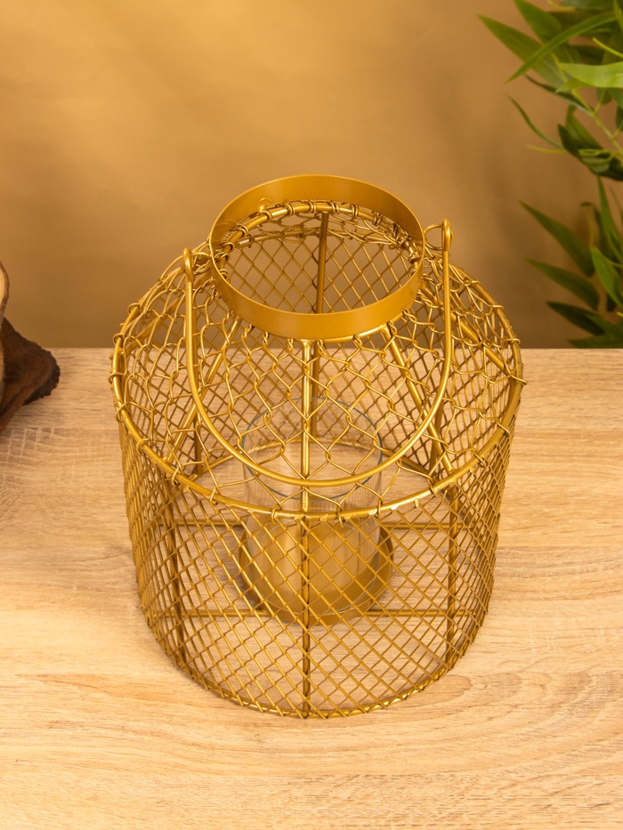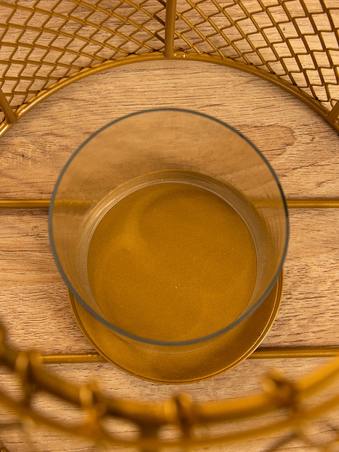Золотистый фонарь-подсвечник со стеклянной колбой — не просто держатель для свечи, а элемент пространства, который работает на свет и форму. Подойдёт для классического, бохо или лофта. Металл с золотистым покрытием не блестит, а мягко отражает свет. Стекло защищает пламя, не искажая его.