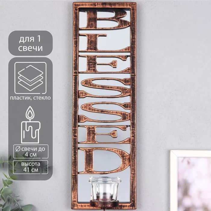 Подсвечник настенный на 1 свечу «Отражение благословения», зеркальный, пластик, стекло, d-4 см, бронза, 8×12×41 см