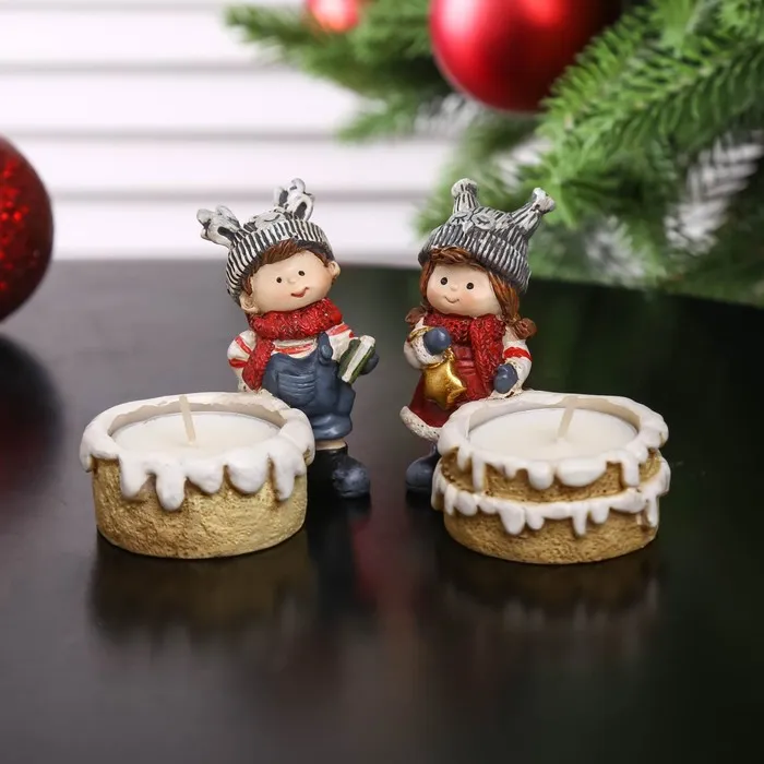 Сувенир полистоун подсвечник со свечой "Мальчик/Девочка в шапочке-зверька" МИКС 7,2х8х5,2 см
