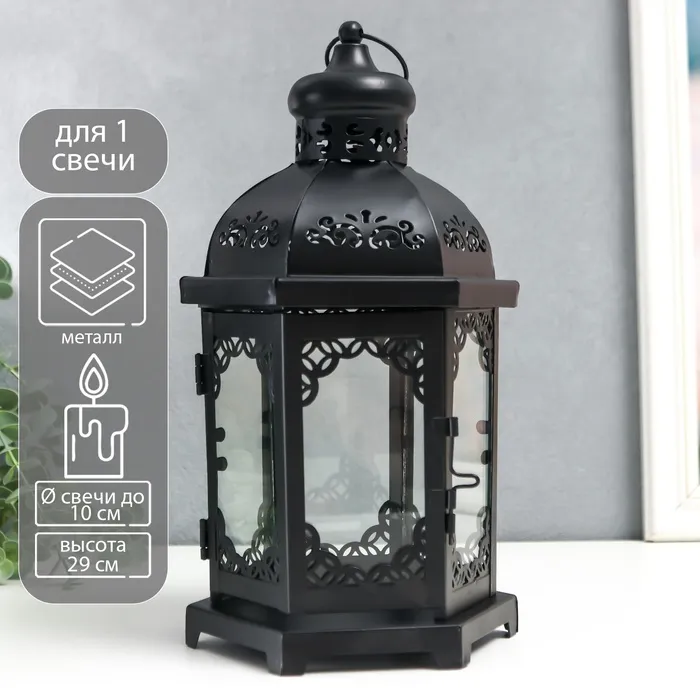 Металлический подсвечник-фонарь на 1 свечу «Цветущие вензеля», стекло, d=10 см, чёрный, 13.5×15×29 см