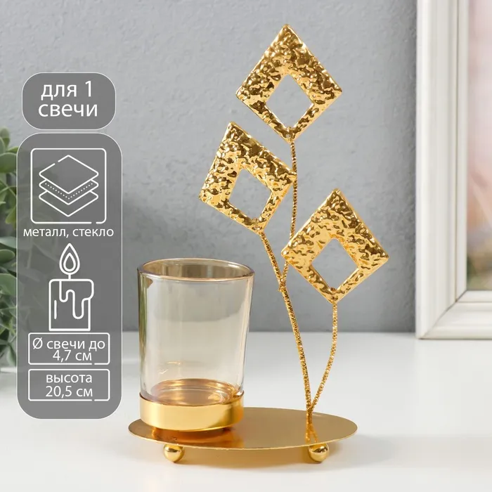 Подсвечник металл, стекло на 1 свечу «Листья-ромбики», d=4.7 см, золото, 13×8×20.5 см