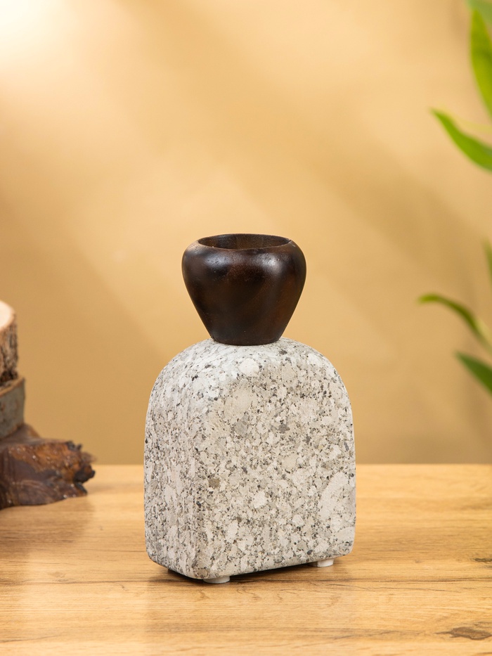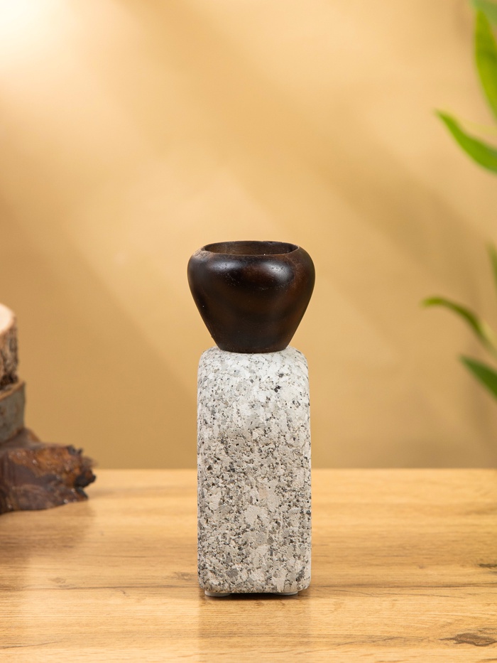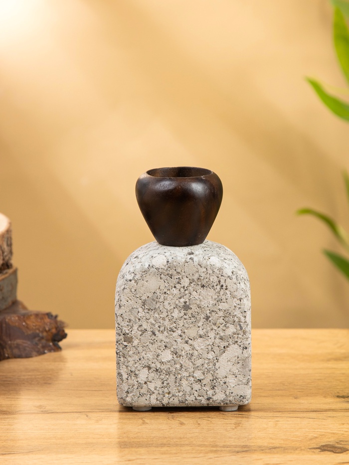 Подсвечник «Каменный факел» — скульптурный акцент из натурального камня и дерева для одного источника света. Его массивное основание и тёплая текстура создают ощущение устойчивости, а серый оттенок добавляет сдержанной элегантности. Без праздничной привязки, он подходит для любого интерьера — от лофта до скандинавского минимализма — и превращает обычную свечу в ритуал.