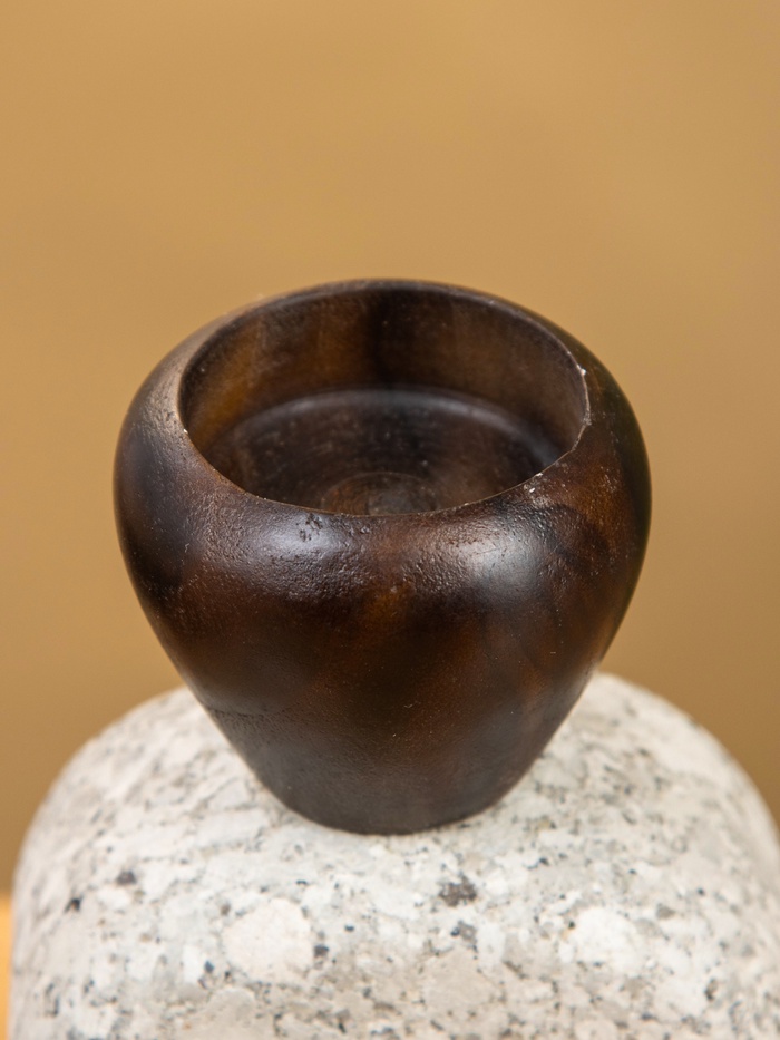 Этот подсвечник не просто держит пламя — он якорит пространство. Камень — земля, дерево — рост, свет — дыхание. ”Зажги — и почувствуй, как дом становится крепостью“.